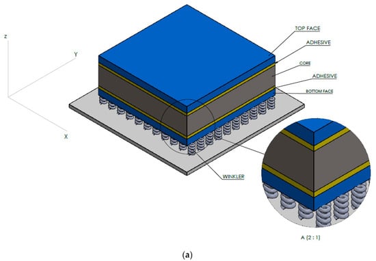 For plated structures using FG materials and resting on elastic foundations, scientists have proposed various kinds of models []. The simplest model for the elastic foundation is the Winkler model. In this model, the foundation is modeled as a series of separated springs without coupling effects []. To better understand the behavior of such structures, several studies were performed to analyze the behavior of these materials used in sandwich plates. Benferhat et al. [] developed an analytical solution to study the free vibration behavior of a simply supported functionally graded plate resting on an elastic foundation by taking into account the effect of transverse shear deformations. Cetkovic and Vuksanovic [] studied bending, free vibrations and buckling of laminated composites and sandwich plates using a layer-wise displacement model. Hafizah et al. [] used higher-order shear deformation plate theory (HSDT) to study the free vibration of antisymmetric angle-ply laminated plates with variable thickness. Zenkour and Radwan [] presented a four-variable refined plate theory to study the free vibration of laminated composites and soft-core sandwich plates resting on Winkler–Pasternak foundations. Moita et al. [] developed a finite element model for vibration analysis of pure functionally graded material structures, as well as for passive damped sandwich structures, with a soft viscoelastic core between the FGM layers. The FGM layers were modeled using the classical plate theory while Reddy’s third-order shear deformation theory was used to model the core.