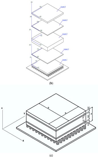 The five-layer simply supported sandwich plate with functional face sheets resting on elastic foundation. (a) Structural constituents of the sandwiched composite plate. (b) Coordinate System for each layer. (c) Structural dimensions of the sandwiched composite plate.
