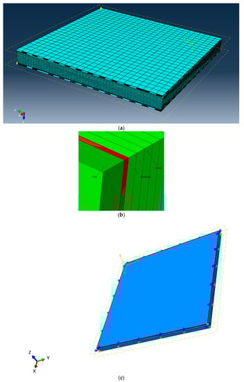 Finite element model of the sandwiched plate. (a) The finite element model of the sandwiched plate resting on simply supported edges. (b) Meshed model of the sandwiched plate showing the subdivisions in the FGM cover plates. (c) Simply supported boundary conditions are imposed on four edges.