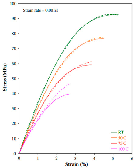 The advantages of vinyl ester resins include high stiffness and tensile strength, good chemical resistance, low cost, process versatility, and fast curing []. They possess good characteristics similar to epoxy resins, as well as unsaturated polyester resins. The shape of the stress–strain curves for a vinyl ester is strongly strain-rate dependent. Similar to strain rate effects, the shape of the stress–strain curve changes dramatically with any change in temperature. In this study, the deformation behavior of a vinyl ester polymer at strain rates 0.001/s and a wide range of temperatures (from room temperature (RT) to 100 °C) was investigated. As an illustration, the effect of temperature on the stress–strain behavior of a vinyl ester polymer at a strain rate of 0.001/s is shown in Figure 3 for different temperatures. At temperatures close to Tg (glass transition temperature) and high strains, viscoplasticity can be more pronounced and therefore, its effect on deformational behavior becomes more pronounced. However, viscoplastic deformation is not considered in the standard linear solid model of the material. Table 5 shows the modules of elasticity of vinyl ester at a wide range of temperatures (from room temperature (RT) to 100 °C) [].