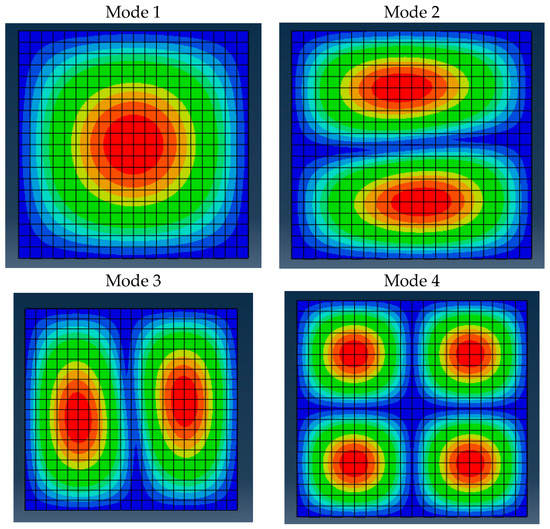 First four mode shapes of the square sandwich plate (a/h = 20) in ABAQUS.