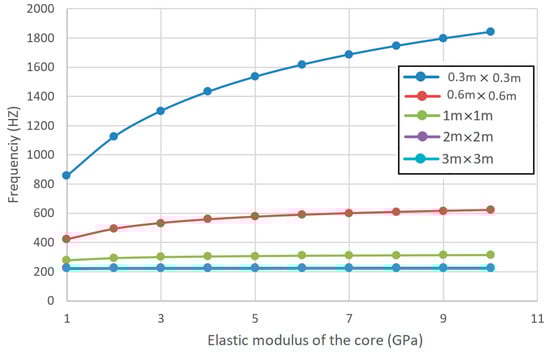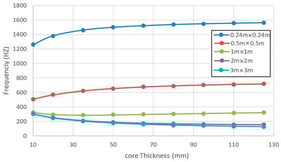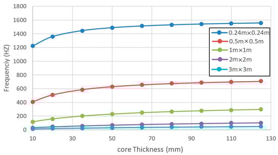 Fundamental frequencies of a sandwich plate for various core thicknesses and dimensions of a × b. .