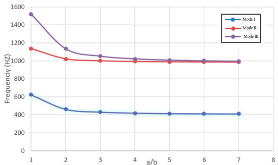 where [K] and [M] are the stiffness and mass matrices, respectively. is the column vector of coefficients (). The natural frequencies are obtained from the nontrivial solution of Equation (23).