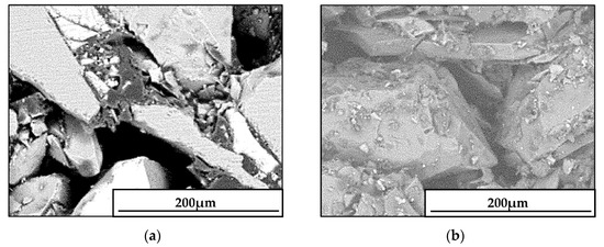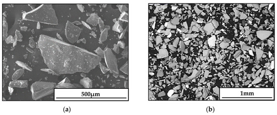 XRF analysis classified the RGA from CRT glass waste as barium glass (56.9 wt% SiO2, 12.9 wt% Na2O, 8.5 wt% SrO, 8 wt% BaO, 7.3 wt% K2O, 3.8 wt% Al2O3) with a negligible concentration of PbO (0.02 wt%). This was also confirmed by the microanalysis of Figure 1c. Figure 1 shows the flat shape and sharp morphology of coarse (Figure 1a) and fine (Figure 1b) RGA, which is attributable to the dry grinding process of CRT waste glass. This evidence was also confirmed by literature and is principally responsible for preferential orientation of particles into the matrix and inhibition of wettability with the polymer matrix, especially for fine ones [13]. Conversely, the quartz sand (99.98 wt% SiO2) displayed a rounded morphology.