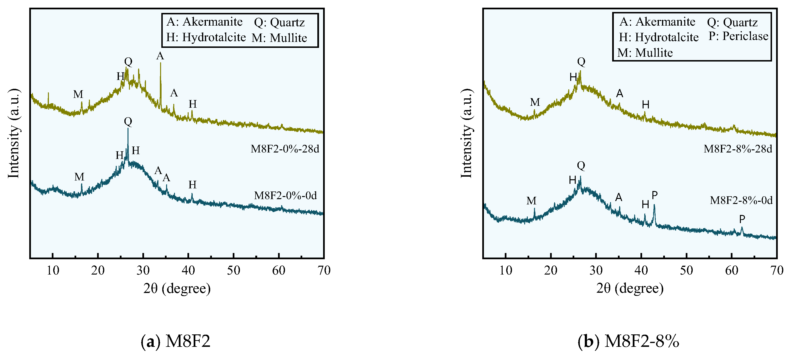 - Zhang, M.; Zhang, H.; Tang, H.; Sun, Y.; Bu, C.; Zhang, J. Improving the carbonation resistance of alkali-activated slag mortars by MgO with different reactivity. Mater. Struct. 2025, 58, 77. [Google Scholar] [CrossRef]