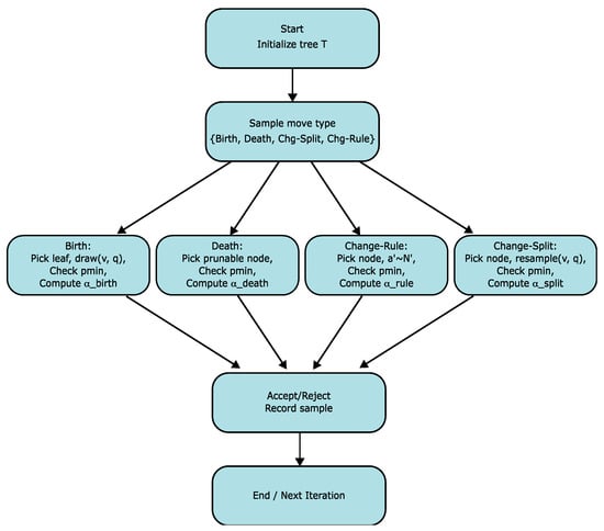 Figure 1 illustrates the workflow of the RJ-MCMC sampler with the sweeping strategy. The flow chart begins at the top to initialize the decision tree T as a single root split or a stump consistent with priors and observed data ranges. The algorithm then runs the sampling loop for N iterations, where at each iteration a move type, Birth, Death, Change-Split, or Change-Rule, is drawn with probabilities , , and .