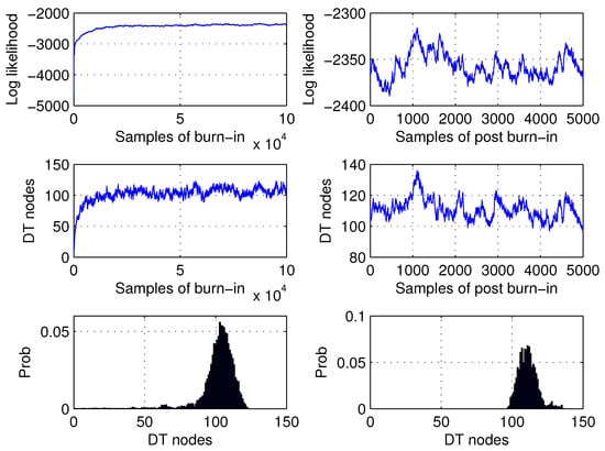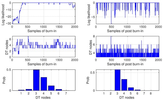 In experiments with these data, we did not use prior information on the DT models. We specified only a minimal number of data points, , which are allowed to be in DT splits. The probabilities of proposal for death, birth, change split, and change rule were set to , and , respectively. The numbers of burn-in and post-burn-in samples were set to 2000. The sampling rate was 7. The variance of the proposal was set to . Performance was evaluated within the 3-fold cross-validation technique. Using these settings, the performance of the proposed sampler was ideal 100.0% on the synthetic benchmark. Each eighth proposal, or of their total number, was accepted. The average size of the DT models, or the number of their splitting nodes, was . Figure 2 shows the log-likelihood samples, the number of DT nodes, and the densities of the DT nodes for the burn-in and post-burn-in phases. In the top-left plot, we see that the Markov chain started at a log likelihood of and then very quickly (during a ca 300 samples) converged to a stationary value close to the maximum, that is, a zero log likelihood. During the post-burn-in, the log-likelihood values slightly oscillate around the maximum. Observing the size distributions of the DT, we can see that the true DT model, which consists of three splitting nodes and variables and , was drawn most frequently during both phases. This is evidence of the ability of the proposed method to discover true models in the data.
