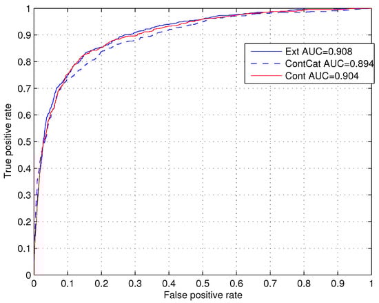 The experiments within the Bayesian framework were run with each of these techniques. The best classification accuracy was achieved for the third technique that provided . The improvement compared to the other two techniques is statistically significant according to the McNemar test with [,]. The performance of these techniques was also compared within the standard Receiver Operating Characteristic (ROC) metric that provides values of the Area Under Curve (AUC). Figure 4 shows the ROC curves and the AUC values calculated for these three techniques. We can see that the technique Ext that uses the extended set of attributes provides a better performance in terms of AUC, which is . The technique Cont, which treats all variables as continuous, provides the AUC value . The technique ContCat, which transforms missing values into category, provides the smallest AUC value of . Additionally, we compare the Cont and Ext methods using ROC and precision recall curves (PRCs), as well as the Brier score for probability estimates, see, e.g., []. In terms of these metrics, the proposed Ext method outperforms the Cat technique. The tests carried out show that the improvement is statistically significant. Table 1 provides the results of these tests.