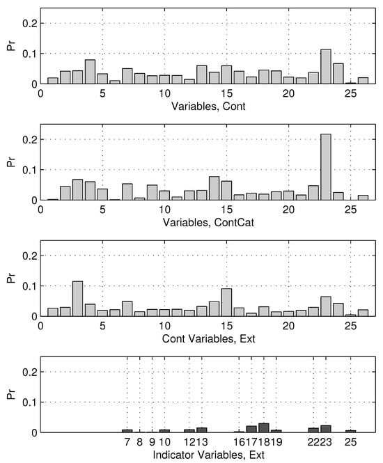 Testing Bayesian strategies for the treatment of missing values, we expect that independent variables, which represent data, contribute to the model outcomes differently. The variable importance, in our case, can be estimated as frequencies of their use in models, which were collected during the post-burn-in phase. Using this assumption, the importance of the variable can be estimated and compared for the three techniques Cont, ContCat, and Ext. Figure 5 shows the importance values calculated for these techniques. In particular, the bottom plot of this figure shows the importance of the 14 binary variables generated within the proposed Ext method.