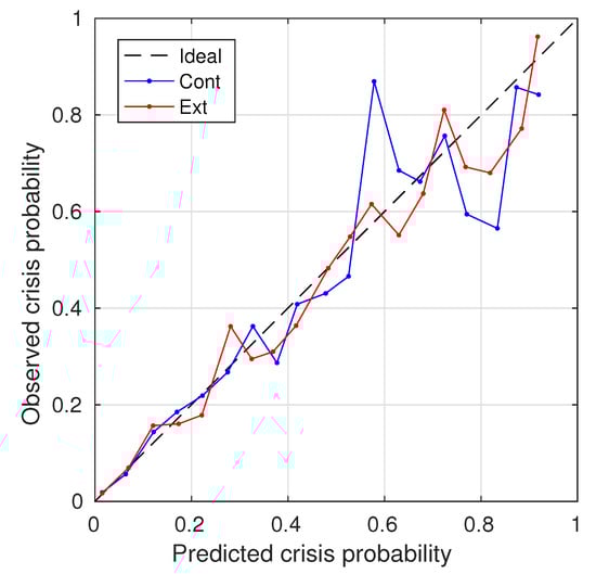 Performances have also been compared using the standard ROC technique, providing values of the Area Under Curve (AUC). The AUC values were calculated for all three techniques. Figure 4 shows the calculated values for the Cont and Ext techniques. We can see that the technique Ext that uses the extended set of attributes provides a better performance, which in terms of AUC is . The technique Cont, which treats all variables as continuous, provides an AUC of . The technique ContCat, which transforms missing values into a category, provides the smallest AUC of . To examine and compare the calibration of models provided by the Cat and proposed Ext methods, we employed the Hosmer–Lemeshow (HL) test, which is typically used for estimating the quality of models; see, e.g., []. HL tests are often enhanced by using random simulation. In our experiments, the Cat technique shows a HL-test value 31.1 and , while the proposed Ext method shows a significantly better calibration 22.8 with . Figure 6 plots the calibration curves calculated for these methods. Figure 7 shows examples of the predictive probability density distributions that were calculated for four correct (left) and incorrect (right) predictions. Observing such distributions, the expert can interpret the risk of making an incorrect decision.