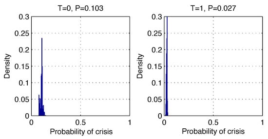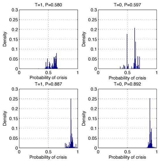 Predictive posterior distributions of crisis probabilities estimated for companies without a liquidity crisis () and at the crisis (). The correct predictions shown on the left side for the cases , , and are made with the probabilities , , and , respectively. A small number of cases with incorrect predictions shown on the right side for the , , and , are made with the probabilities , and , respectively.