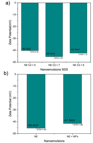 For the nanoemulsion formulation, the organic phase was slowly added into a stirred aqueous phase, consisting of different concentrations of SDS in 20 mL of ultrapure water, based on the average value of its critical micelle concentration (CMS). At the moment of the interaction, the formation of a turbid/white solution presenting Tyndall effect should immediately appear.