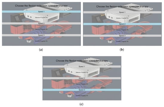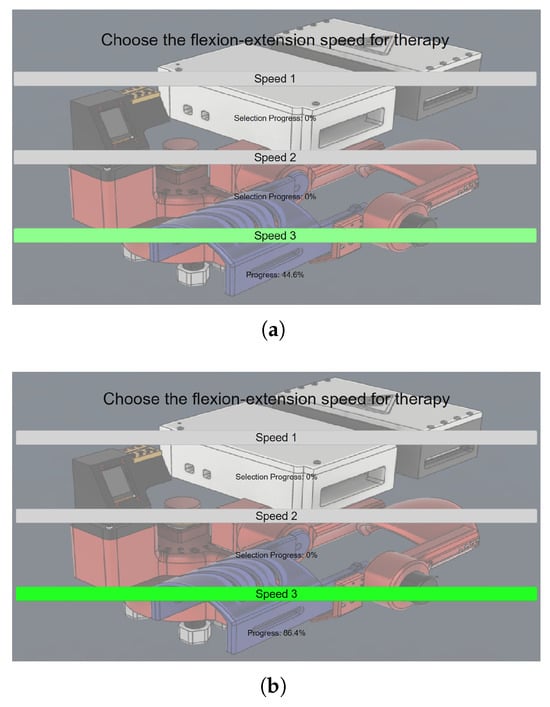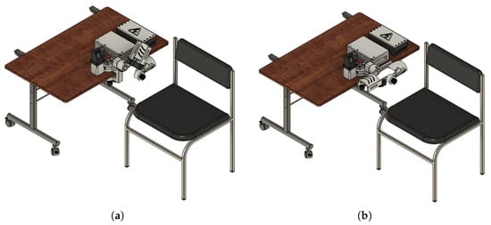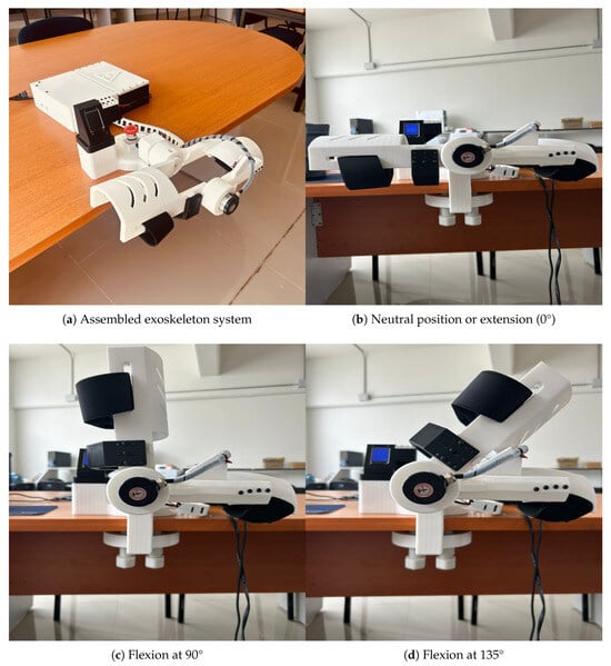 Figure 5 illustrates the exoskeleton in its two extreme positions: full flexion (Figure 5a) and full extension (Figure 5b). These images also include the stationary support modules for motor driving, system control, and power supply, which are integrated into the system’s base to grant mechanical stability and minimize dynamic loads on the user’s limb.