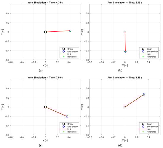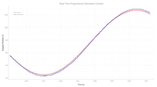 Automatic control plays a key role in achieving precise and repeatable motion of the device, ensuring safety within established ranges and smooth operation along the desired trajectory. The dynamic behavior of the system can be described by differential equations, and over the last five decades, a broad range of control strategies has been developed to address different control objectives such as position regulation, velocity tracking, or force control. In recent years, advanced control approaches have been successfully applied in diverse engineering domains, including nuclear reactor regulation [], renewable energy systems [], and nonlinear process control [], demonstrating high performance in complex, nonlinear, and uncertain environments. Although these sophisticated controllers offer excellent capabilities, they typically require detailed plant modeling, significant computational resources, and extensive tuning efforts. Since the primary control objective is angular position regulation, high computational power is not required. Adequate performance with high precision and low steady-state error can be achieved using simpler control strategies. For the present work, a Proportional–Derivative (PD) controller was selected due to its simplicity, robustness, and efficiency in position tracking, making it well-suited for real-time implementation on embedded systems with limited computational capacity.