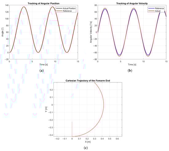 The numerical simulation of this dynamic model was performed using parameters derived from the exoskeleton design. The moment of inertia I was obtained from the CAD model’s inertia tensor and the material density. The link mass m was set based on the average adult forearm weight (1.4–1.8 kg) [,]. These static data were used to check the torque demands and system response in the simulation.