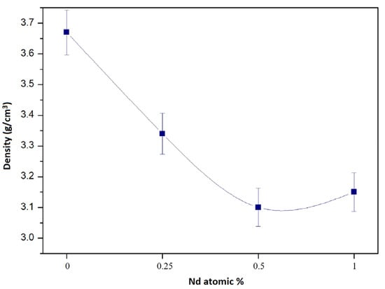 Apparent density of sintered Y3Al5O12 as a function of the Nd content in it.