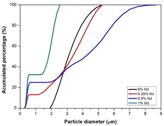 Particle size distribution of ground powders with different neodymium additions.