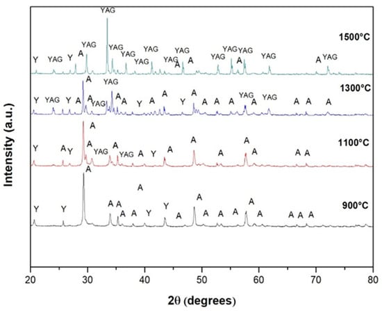 Figure 3 shows the diffraction patterns of the Y2O3 + Al2O3 powder mixture that was subjected to interrupted tests at different temperatures to observe the progress of reaction 1 and to determine the formation of the Y3Al5O12 compound. In this figure, it can be seen that at 900 °C, Reaction 1 did not start. This can be affirmed because the crystalline phases present here correspond to the two original components of sample Y2O3 + Al2O3. At 1100 °C, the first traces of the desired garnet formation begin to appear, becoming more abundant at 1300 °C. At 1500 °C, the predominant crystalline phase in the sample corresponds to that of yttrium aluminum garnet (Y3Al5O12), although some traces of the alumina phase are still observed in the corresponding spectrum. The minimal width of the peaks and their intensity indicate the strong crystallinity of the compound formed. From these spectra, it can be summarized that Reaction 1 starts to occur at approximately 1100 °C and is almost completed at 1500 °C. To eliminate the remaining traces of alumina and yttria at 1500 °C, the samples could be sintered at a higher temperature, e.g., 1550 or 1600 °C.