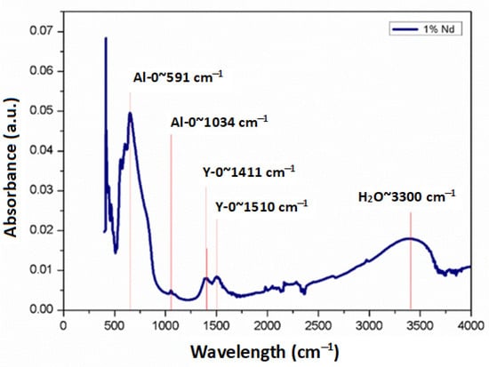 FTIR spectrum obtained from the sample sintered at 1500 °C with addition of 1 at. %Nd.