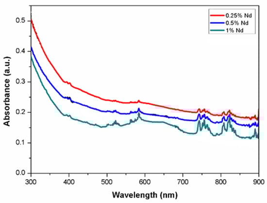 Absorption studies were performed for the samples with additions of Nd in atomic percentages of 0.25%, 0.5% and 1%. Figure 5 shows the comparative absorption spectra for each of the samples. Predominant absorption bands can be better observed from the 1% Nd sample at around 750 and 810 nm, corresponding to transitions from the 4I9/2 ground level to 4F7/2:4S3/2 and 4F5/2:4H9/2 levels, respectively. In addition, peaks at 520, 590 and 880 nm are also present. It can be seen that the bandwidth and the peak shape are the same for the samples with neodymium content; however, as the concentration increases, the peak absorbance becomes greater.