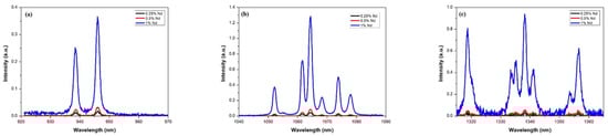 Emission studies were carried out at wavelengths from 930 to 1370 nm for the three samples doped with Nd. Figure 6 shows the comparative emission spectra for each of the samples. As can be seen, the peak intensity increases as neodymium concentration increases. Still, the shape of the peaks and the bandwidth are maintained in all cases, which is important in laser emission applications. The emission spectra are presented in the three predominant regions due to radiative decay from the 4F3/2 state to the 4I9/2, 4I11/2 and 4I13/2 states, which can be seen in the figure. The energy levels of Nd:YAG are determined by the neodymium (Nd) ions in the YAG; the predominant radiative transition at 1064 nm occurs between the upper stark level of the 4F3/2 state and one of the 4I11/2 states. The synthesized materials could have potential application in the development of a laser that emits in the near infrared region. As depicted in Figure 6, the spectrum shows a broad emission range that could be used for tunable lasers. For example, Okhapkin et al. [] reported a tunable Nd:YAG laser with an operating range between 945 and 946 nm. In comparison, Figure 6a shows that at the 4F3/2 to 4I9/2 transition, two emissions could be utilized in laser tuning from 937 to 939 nm and from 946 to 948 nm. The primary emission shown in Figure 6b corresponding to 1064 nm could be used in double frequency lasers at 532 nm for medical procedures [,]. In addition, other emissions observed in the same transition with corresponding peaks ranging from 1052 to 1078 nm could be used for similar purposes. Regarding the third transition from 4F3/2 to 4I13/2 shown in Figure 6c, the emission peaks are similar to laser wavelengths reported recently by Zhu et al. [] but with the advantage of an additional emission at 1336 nm.