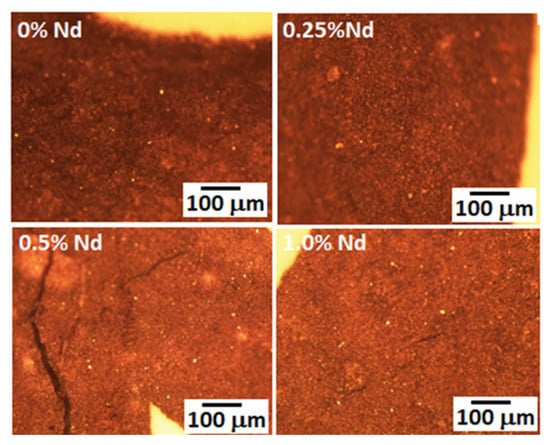 The microstructures of synthesized Nd:YAG obtained from the optical microscope are shown in Figure 7. In general, the microstructure is very fine, made up of irregular grains of different sizes and morphologies (angular, rounded, etc.). Due to the fine microstructure, the porosity of the samples cannot be distinguished. In fact, finer particles are obtained for intermediate Nd contents (0.25 at. % and 0.5 at. %). However, the sample with a 0.5 at. % Nd cracked. According to density measurements, the higher the amount of Nd in the garnet, the lower the bulk density, a situation difficult to observe in these images. However, the very fine size present in these composites due to the type of processing carried out to manufacture them positively influences the optical properties of the composites, as already observed above. This suggests that if the processing conditions of these composites can be better controlled to obtain denser bodies, the optical properties will be further improved.