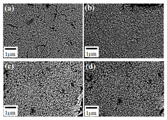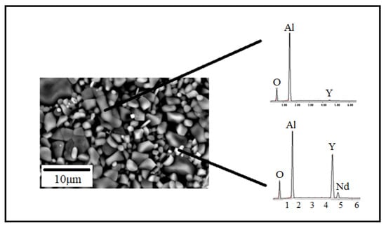 The general microstructure of sintered Nd:YAG samples observed with scanning electron microscopy (SEM) is depicted in Figure 8a–d. In these pictures, it is possible to observe that the microstructure in all samples is composed of irregular grains of varied sizes and particle shapes. The samples exhibited a wide distribution of particle sizes with a multimodal behavior. Their micro-structure is composed of larger grains with different contrasts (brighter zones) and various morphological features. These bright grains with different neodymium concentrations are associated with compounds formed during the YAG processing, as detected by SEM-EDS (Figure 9).