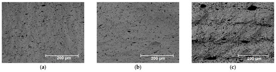 The morphology of the samples was analyzed using a Hitachi 3400N scanning electron microscope (Hitachi, Tokyo, Japan). The paste viscosity was measured using a Brookfield DV3T-RV viscosimeter (Brookfield Engineering Labs, Middleborough, MA, USA) with the cone/plate geometry at 25 °C. The granulometric composition of the samples was analyzed using a SALD-7500 nanolaser particle analyzer (SHIMADZU Corporation, Kyoto City, Japan). The contents of the pores in the sample were determined by means of ImageJ software (ImageJ 1.53k) using SEM images.