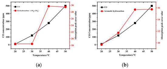 From Table 3, it can be seen that the proportion of aromatic hydrocarbon functional group content with the increase in water bath temperature generally shows a rising trend and then decreases. At around 30 °C, the number of aromatic hydrocarbons increases, while the number of other functional groups does not change significantly, so the proportion of aromatic hydrocarbons increases. At the 40~50 °C stage, although the number of aromatic hydrocarbons still increases but other functional groups also show a growing trend so their proportion decreases. The aliphatic hydrocarbon components and carbonyl groups play a major role in the low temperature oxidation process of coal [21]. The proportion of aliphatic hydrocarbons is the lowest compared with other temperatures at 40 °C, while the proportion of carbonyl groups is the highest. Aliphatic hydrocarbons are easy to oxidize with oxygen in the low-temperature environment to generate various oxygen-containing functional groups, including carbonyl group. The carbonyl group is slow to oxidize in this low-temperature environment, and the generation rate is larger than the decomposition rate. Therefore, as the proportion of carbonyl increases in the 50 °C environment, the decomposition rate accelerates, and the proportion begins to decline. With the increase in water bath temperature, the hydroxyl and carboxyl groups showed a trend of rising first and then falling, and the content of hydroxyl and carboxyl groups in No. 2 coal sample was almost unchanged compared with No. 1. It can be considered that the environment of 30 °C had almost no effect on hydroxyl and carboxyl groups. The proportion of hydroxyl and carboxyl groups in coal sample No. 3 increased, the rise of carboxyl groups in it reached 20.5%, the generation of hydroxyl and carboxyl groups was greater than the decomposition amount and the oxidation of aliphatic hydrocarbons occurred in the 40 °C environment. The reaction generated a variety of peroxides. Peroxides are unstable and further oxidize to generate hydroxyl, carboxyl and other oxygen-containing functional groups. The 50 °C coal samples showed condensation and elimination of hydroxyl groups, and the decomposition rate of carboxyl groups was greater than the generation rate, and the content of both decreased [22]. The content of the ether bond increases continuously with the increase in the water bath heating temperature. It can be seen that in the coal samples in the water bath at different temperatures, there has been the generation of ether bonds, and the generation rate is greater than the rate of decomposition. Combined with the CO content in each coal sample tank, each functional group was analyzed one by one. A line graph of the CO concentration versus the absorption peak area value of each functional group was plotted, as shown in Figure 5.