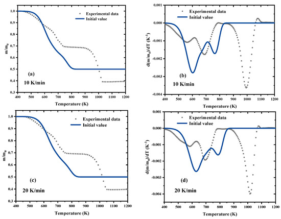 It is no wonder that the estimated results based on the initial kinetic parameters fail to accurately reflect the experimental mass loss process (left column) and capture the peak locations in the mass loss rate (right column), resulting in significant deviation. Consequently, the SCE algorithm is employed to optimize the initial kinetic parameters in order to address this deviation. The search range for Ea and lnA is set as 20% to 200% of the initial values, the reaction order n is set to 0–5.00, and the residual yield ν is set to 0–1.00 [36]. Consequently, a total of 14 parameters are required to be simultaneous optimization, as presented in Table 2.