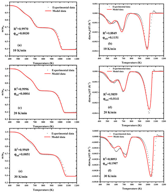 where φml and φmlr are the objective functions for mass loss (m/m0) and mass loss rate (d(m/m0)/dT), respectively. N is the number of experiments, and n is the number of experimental data points for each experiment. The subscripts mod and exp refer to the modeled values and experimental data, respectively. The minimum value of the objective function can be searched within the prescribed parameter search range, which means that the optimal optimization results can be obtained.