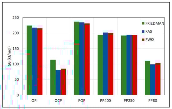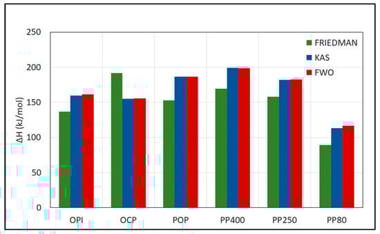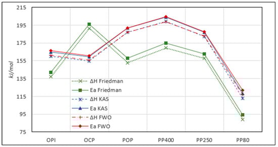 The average activation energy and pre-exponential values for each sample and method are reported in Table 8 (note that the results for OPI and OCP have been reported by Castells et al. []).