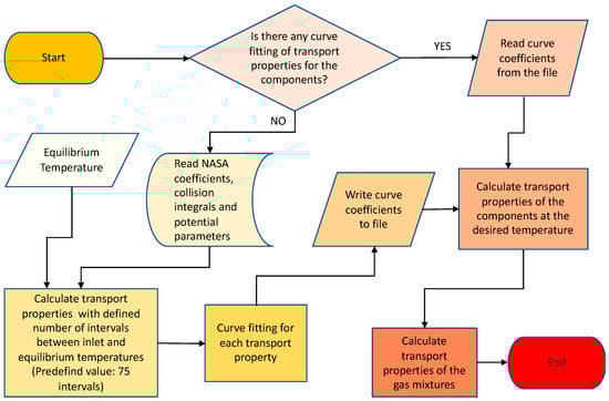 Thermophy is constructed in order to determine viscosity, thermal conductivity, and diffusion coefficients of pure gases and gas mixtures for combustion simulations. For the architecture of the molecular structure, three kinds of pairs are considered: atom pair 0, linear molecule 1, and non-linear molecule 2. Our preliminary results showed sufficient accuracy with the literature data (deviation is below 5%). However, the program appears to be a processing load within the first version when it is used as a subroutine program for combustion analysis. In this case, the transport properties of pure gases were recalculated at each temperature change, while iterative solutions were made. Thus, the equations (given in Section 2) used for the calculation of the transport properties of pure gases were repeated for each iteration, which leads to the repetition of both linear interpolation and bilinear interpolation of the table values of the transport properties. So, we changed our mental model in order to solve the problem above to construct a program friendly to users. It is known that the temperature obtained after the equilibrium solution is the theoretically highest temperature of an adiabatic system and the inlet temperature is the lowest temperature. In this regard, transport properties were calculated at the temperatures specified by the user between these two temperatures. Moreover, for each transport property value, a separate curve was fitted using Chebyshev polynomials that can also be changed by the user. For curve fitting and the recalculation of fitted curves with coefficients, subprograms were implemented from the literature in FORTRAN language [,]. Calculated transport values of pure gases were written in a separate file, thus, the required computational time limitation will prevent a user from computing during further iterations or different computing studies with the same components. Thus, a computation of the transport property data is performed with the recalculation of fitted curves with coefficients. The main structure of the program is shown in Figure 1. Since the algorithm of the program is presented, researchers can easily reproduce with their codes using whatever language is chosen (i.e., Python).