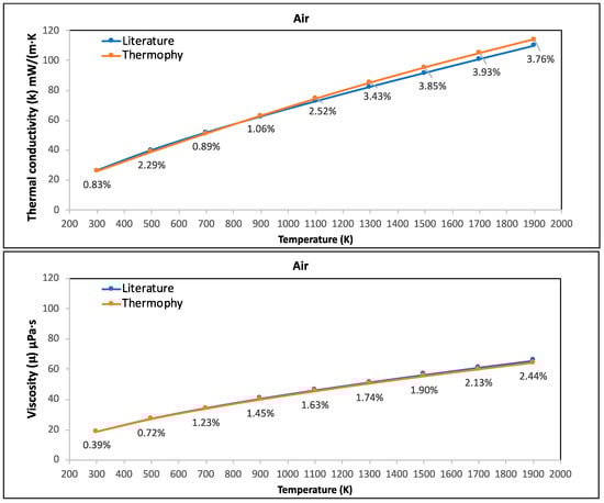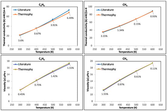 With Thermophy, we compute the values of viscosity and thermal conductivity of some pure gases and air using transport properties [,,], which is compared with the tabulated data from the literature []. Figure 2 shows thermal conductivity–temperature and viscosity–temperature curves of C2H6 and CH4 gases obtained from tabulated data [] and Thermophy.
