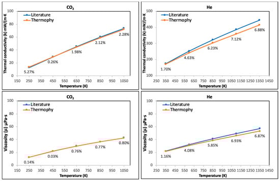 Thermal conductivity and viscosity of CO2 at temperatures between (250 and 1050) K and He at temperatures between (350 and 1350) K. The plotted values on the lines are Thermophy results of this work and tabulated data from the literature []. Percentage deviations between Thermophy data and tabulated data for each temperature are plotted.