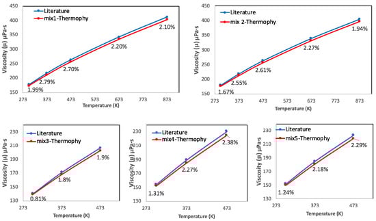 , mix2: , mix3: , mix4: and mix5: . The plotted values on the lines are Thermophy results of this work and experimental data from the literature []. Percentage deviations between Thermophy data and experimental data for each temperature are plotted.