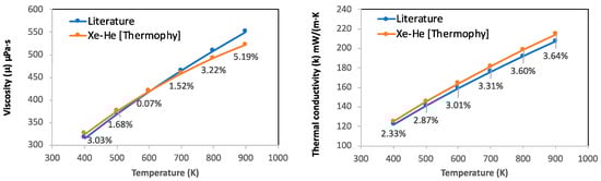 The values of viscosity and thermal conductivity of Xe-He binary gas mixtures with a molar composition of via Thermophy, which is compared with the data obtained from the literature []. Thermophy calculated viscosity data at temperatures between (400 and 900) K confirm the viscosity data from the literature with a maximum deviation of 5.19% (Figure 6). Similarly, thermal conductivity of the computed Thermophy data at temperatures between (400 and 900) K agrees with the literature data considering the maximum deviation of 3.64% (Figure 6). Overall deviations obtained from viscosity and thermal conductivity values considering each point of temperature were 2.60% and 0.20% for Xe-He, respectively. It is noteworthy to mention that in this study, Thermophy confirms the maximum deviation value of 5% given in our preliminary study with the first version of Thermophy where some problems were encountered from processing. However, in this study, Thermophy achieves successful computing of the thermophysical values of the gas mixtures that is consequently suggested to be useful and sufficient data for combustion analysis.