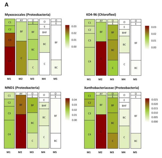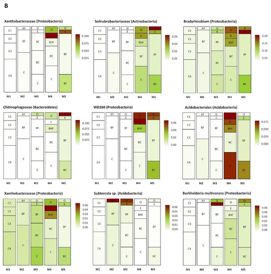 Distribution (heat map) of specific taxa in the soil profiles (the pictures were drawn to show the exemplary spatial architecture of the soil profile, using the depth measurement of the soil horizons). Only taxa with significant differences in their abundances (expressed as the percent of the total microbial number of the amplicon library, marked with color range from red—the most abundant to white—the less abundant) are shown. A–C are the phylotype groups, separated according to their tendency to concentrate in particular parts of the soil profile. O, E, AY, BHF, BF, BC, and C are soil horizons.