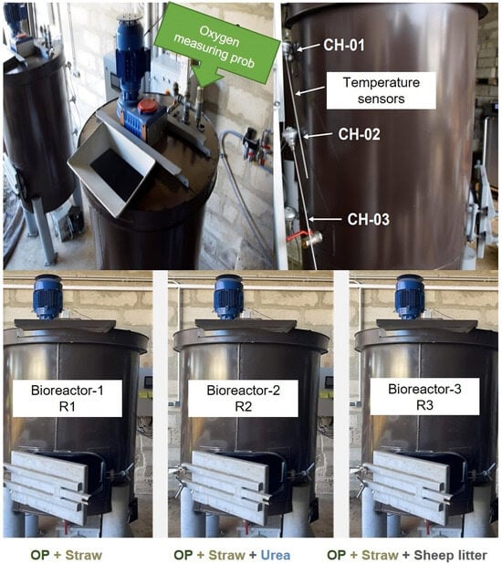 Three bioreactors were used to compost olive pomace (OP), which are custom-made vertical cylindrical drums with a storage capacity of half a ton, designed to simulate controlled aerobic composting conditions. Each bioreactor is equipped with sensors to monitor temperature and oxygen levels. The temperature probes were placed at different depths, and oxygen probes were positioned near the top of each reactor (Figure 1). The airflow was 0.4 m3/h to ensure aerobic conditions. Temperature was recorded at 30 min intervals. The complete temperature dynamics and oxygen concentration are provided in Figures S1 and S2. Each bioreactor was then prepared as follows: Bioreactor-1 (R1 used as control) contained 120 kg of fresh OP (76.9%) and 36 kg of barley straw (23.1%; total 156 kg); Bioreactor-2 (R2) used the same OP (76.9%) and straw amounts (23.0%) with an additional 861 g of urea (0.1%; total 156.86 kg); Bioreactor-3 (R3) included 120 kg of OP (72.3%), 36 kg of straw (21.7%), and 37 kg of sheep litter (6.0%). Treatments varied in the type of nitrogen source added, i.e., no added nitrogen source, urea, and sheep litter, reflecting typical composting scenarios. Barley straw was added as a constant baseline component. The composting process lasted for 5 months, during which the contents were turned every three weeks to maintain aerobic conditions and promote microbial activity. For chemical analysis, 1000 g of raw OP was oven-dried at 60 °C for three days (UF160, MEMMERT, Schwabach, Germany), then equilibrated at room temperature to a constant weight. Finally, the samples were ground to pass through a 1 mm mesh sieve (RETSCH-Allee 1-5, 42781 Haan, Germany) and then homogenized.