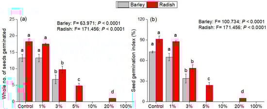 The results showed a significant, dose-dependent inhibition of seed germination in radish and barley when OPF concentration increases (p < 0.05; Figure 2). In the control group, 18 radish seeds germinated, compared to 17, 12, and 4 seeds at 1%, 3%, and 5% OPF, respectively, representing reductions of 5.6%, 33.3%, and 77.8%. Complete inhibition (100% reduction in germination) was observed at 10%, 20%, and 100% OPF concentrations (Figure 2a). A similar trend was observed in barley: 14 seeds germinated in the control, whereas only 10 and 9 seeds germinated at 1% and 3% OPF, corresponding to decreases of 28.6% and 35.7%, respectively. No germination occurred at OPF concentrations of 5% and above, indicating complete inhibition (Figure 2a).