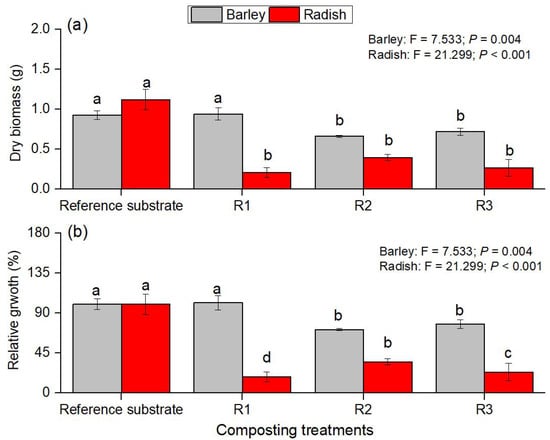 The effect of composting treatment on shoot dry biomass (a) and relative growth (b) of radish and barley. R1 indicates Bioreactor-1, R2 indicates Bioreactor-2 and R3 indicates Bioreactor-3. The data are presented as mean ± standard error (n = 4). Different letters above the error bars indicate statistically significant differences between treatments (p < 0.05) as determined by Tukey’s test.