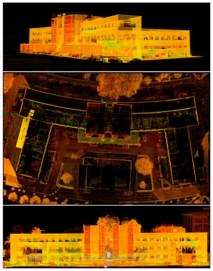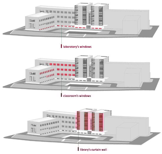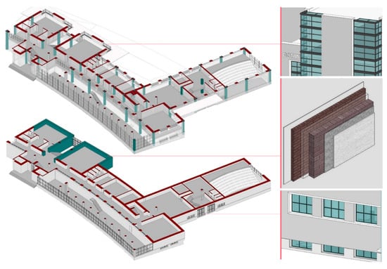 In the case of the Botany Institute, the classification of the elements and their modeling perfectly followed the design of the building. The HBIM process manages the serial elements by modifying dimensional parameters for the modeling of structural elements and for windows. Data acquisition comes from the 3D massive data capture technique—3D laser scanner and topography. It provides information on geometry, dimensions, materials, and their state of preservation, verifying and integrating the great amount of data deriving from the archival documentation [,] (Figure 5, Figure 6, Figure 7, Figure 8 and Figure 9).