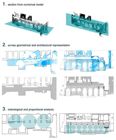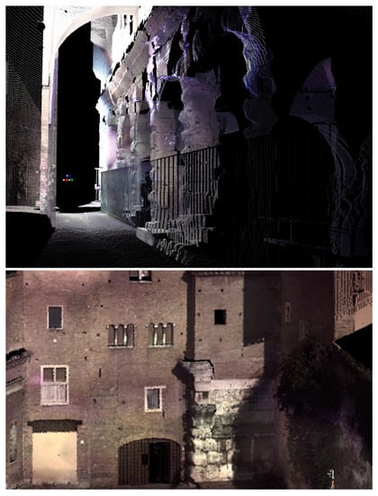 The Italian territory is full of buildings with historical and cultural value, which require more or less invasive transformation. For this reason, methods and tools to store, share, and manage information on their past, present, and future status are necessary. This implies continuous updating between the methods of massive data acquisition, more and more precise in metric accuracy, and digital models, ever more complete for information quality [,]. The presence on the territory of a very high number of existing buildings, many of them of high historical and cultural value, which require more or less incisive transformation interventions, has favored the extension of a European directive of 2014 (EUPPD 2014/24/EU). It promotes a new approach concerning the entire building process (design, representation, construction, management, and maintenance) and invites the use of BIM not only for new construction interventions but also for restoration, adaptation, or maintenance. In this context, it is necessary to keep in mind the link between these operations and knowledge and documentation of the history and current-state of the artifacts. They are closely connected with the activities of acquisition of historical heritage data. The integration of survey data, now increasingly complete, heterogeneous, and shareable, and the HBIM systems, allows for a lot of reality-based information to be brought in. This information (metric, geometric, morphological, material, chromatic) expressed through digital models allows for improvement of the knowledge of the building and offers control using the acquired data in the development of subsequent projects.