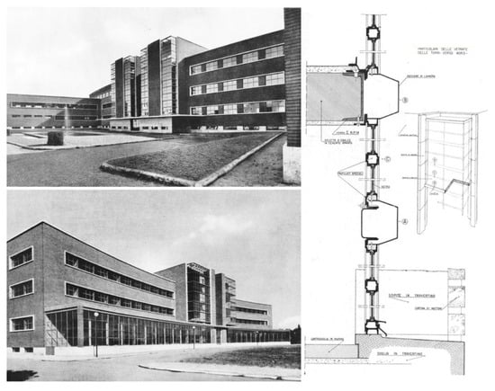 The Botany Institute. Archival documentation from Sapienza technical office. Photos (left) from Guidi, Francesco, 1935. L’Istituto di Botanica e Chimica farmaceutica—arch. Giuseppe Capponi. In Casa dell’Architettura di Latina, 1935—XIV numero speciale. La Città Universitaria di Roma, pp. 65–66. Detail of curtain wall, from: Guidi, Francesco, 1935. Caratteristiche tecniche e organizzazione esecutiva delle opere nella Città Universitaria. In Casa dell’Architettura di Latina, 1935—XIV numero speciale. La Città Universitaria di Roma, p. 86.
