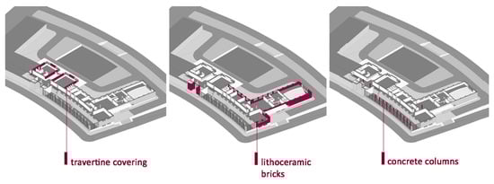 The theoretical implications related to the process followed are rather complicated because the modeling of particular conformations of an architectural artefact often goes beyond its tangible, directly observable, and measurable appearance (Figure 3 and Figure 4). This means that it was important to consider the information aimed at obtaining and communicating knowledge of the structures as wide as possible, and to be critical of the simplification choices in the modeling phase. The collection and the analysis of survey data, both semantic and typological, allowed for spatially defining the visible parts of the surfaces, recognizing the materials, and discovering the construction rules and transformations that the building had undergone. This knowledge is important for the components of the HBIM libraries: to develop the details stored behind the surfaces of the parametric objects, concerning the materials and components of the building, their cultural aspects and the historical memory, entering data storms to represent the architectural transformation of the entire life cycle of the building, provides a more in-depth reading of the state of conservation and favors the development of a more adequate maintenance program [,]. But even more, this allowed for the generation of digital models of buildings with similar stylistic and formal characteristics, approaching a solution for reverse engineering modeling based on the optimization of parameters and work times. Parametric and informative modeling for historical heritage clashes with the geometric transposition of the continuity of the real world, and of surveying data. The Botany Institute has several emergencies that express a formal but above all a functional unit as a whole, which made it necessary to outline a work that considered the general and detailed aspects, alongside the metric analysis of the data of the tangible material aspect. An integrated instrumental survey followed the initial phase of historical documentation. The strong solidity of the masses to be analyzed, combined with the size of the building under examination, justified a network of laser scans (1 × 1 cm), conducted with a 3D laser scanner time of flight (Leica ScanStation C10). The interior space (except for the entrance hall and connecting elements), due to the articulation in rooms intended for classrooms and offices, was surveyed through direct methodologies and through Structure from Motion (Nikon D40× digital reflex camera) for their speed of execution. These techniques were also used for the documentation of the complex of the Temple of divo Claudio. The surveying integrated 3D laser scans with a high level of detail (0.5 × 0.5 cm) and the photographic images in order to have very accurate information about the dimensions and the state of conservation of the architectural masses. The next stage of data processing was necessary because surveying data are not selective, and sometimes it is not possible to have all the necessary information [,,]. Moreover, the construction of libraries of digital objects presupposes the inevitable comparison with the variability and uniqueness of the built environment, especially when it has ancient origins, or is the result of the stratification of different interventions, or is found in a poor state of preservation. The application of the methodology has shown different results due to the analysis of the survey and its relationship with the architecture analyzed.
