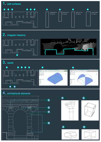 The study by Nieto et al. (2016) [] proposes, instead, an innovative process for the cataloging information on artifacts of rather high complexity (i.e., archaeological architecture. The data analysis starts with the definition of grids on the surfaces analyzed for the study of the changes that the different elements have undergone over time. Other authors, such as Oreni et al. (2016, 2017) [] and Barazzetti et al. (2015) [] promote the structure of HBIM libraries for structural analysis, which analyze, in detail, elements of which it is necessary to know the geometry and, above all, the variations in the repetition of similar components. The research presented by Quattrini et al. (2015) [] is interesting because it considers the numerical model as a source of information in its complexity. Therefore, it is not sectioned or fragmented, and the modeling of components takes place directly on the raw data. It guarantees quality and precision in the modeling of regular geometries, built using the Autodesk Revit parametric element libraries, and the complex ones, created through B-Rep operations of. The research group use an additional open source plug-in, Protégé, to integrate parametric data with each modeled element.