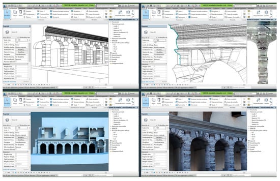 For the Temple of divo Claudio, the operations of surveying and the survey were the main elements for reading the irregularities of a stratified complex. Metrological and proportional analysis allowed for the optimization of the modeling operations, and the knowledge of the complex, just partially documented []. It emerged how the criterion for the decomposition of Botany’s building followed the rationalist characteristics of the structure. It cannot be used for a building with a strong historical-archaeological component. What has arrived today of the Temple of divo Claudio is only a part of the ancient complex, of whose structure there are no visible traces. For this reason, its decomposition started from the identification of the structural component, which is clearly significant in the volumetric system and in the architectural components of the first building, but is less significant in the second. The shape of the Temple of divo Claudio took place simultaneously with the proportional analysis and that of the state of conservation. The proportional analysis revealed the existence of compositional rules, easy transferable to a parametric modeling environment, and the existence of a basic constructive module [,]. It is not only in the general construction but also in the detailed architectural components (Figure 10). The analyzed parts of the building showed a ratio of 1:3 between width and length, respectively; the unit contains 19 times the main module, identified in composition in the diameter of the pilasters, whose size is equal to twice that of the Roman foot, 29.6 cm. All the pillars of the arches of the main elevation have the same number of travertine blocks, whose geometry and dimensions correspond to multiples of the design module. The blocks maintain the same width, equal to 3 + 2/3 roman feet, but they have different heights, always multiples of the unit. The rule found in the proportions of the bays and in the blocks that make up the pillars; however, contrasted with the wall structures of the rear part, with sections and profiles in which it is not possible to recognize a geometric regularity. In the HBIM of the Temple of divo Claudio, the modeling of travertine blocks was adapted to impose constraints, so the study of dimensional variations and proportional ratios allowed the use of the generator module as a parameter. The modeling operation of hexagonal blocks, the capitals of the pilasters, and the keystone was repeated within the overall model, without considering the slight local variations. The BIM process for other architectural elements was different and linked to particular objects.