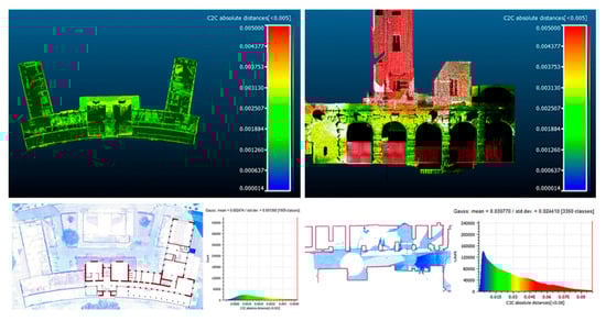 Assuming; therefore, that the built models do not fully represent the buildings analyzed, it is necessary to evaluate both the metric accuracy and the reliability [,,]. The comparison between the numerical model and the geometric/parametric model (BIM) constitutes proof of any inconsistencies between the semantic structure of the model and the real object. The deviation between the two models shows the deviations between the ideal form, described in the BIM model at the geometric level, and the objective one, described by the numerical model from surveying.