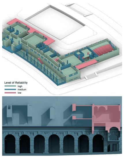 Another evaluation is the LOR (level of reliability). It shows how knowledge processes are always gradual, connected to the continuous possibility of new investigations and to the interpretation of heterogeneous information (Figure 14). The control of the semantic structure of digital objects implies more complex dynamics, less objective than those concerning the geometrical correspondence and the correct structural of the models. Actually, there are no applications similar to the model reviewer application that allow critical controls to be carried out on semantics within HBIM. A significant proposal in this field relates to the coding of a new parameter able to fill the insufficiency of the standard parameters that, in the BIM processes, measure the reliability of technical information. For LOD and LOI (level of information), recent research adds LOR (level of reliability), which measures reliability in terms of overall consistency of the process that defines any digital object [,,]. The parameter relates the geometric reliability of digital objects to their ontological correspondence with the real shape they describe. Several factors influenced the geometric reliability of the model: The parameterization of the geometric shape of the elements; identification of geometric and compositional rules; and the comparison between the acquired data (through surveying operations or through archive sources) and the parametric model. The factors that influence the ontological correspondence of digital objects are much more complex to analyze because they come from subjective activities, and because they tackle the problem of overcoming the surveyed surface. In this case, data referring to the evolutionary phases of the object take over; the knowledge of construction techniques and materials used are derived from additional surveys (stratigraphy, conformation of architectural or structural elements, etc.); the identification by analogy with contemporary or similar buildings. The definition of the level of reliability is regulated by a numerical scale ranging from 0 to 10 for each digital element, with respect to the corresponding architectural element. LOR 0 represents a symbolic digital object, while the LOR 1 is reserved for known objects in very high detail. A diagram structured in this way not only simplifies the reliability of each modeled digital object, but can also be useful in the process of decomposing and reconstructing the artifact, in which the final score is incorporated into the information model as one of the attributes of the digital object (Table 1).