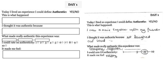 Regarding investigation (c), we asked participants to keep a diary for 8 days and focus on what they experience daily, keeping track of events and emotions. Figure 2 reports an example of the used template and of a completed page.